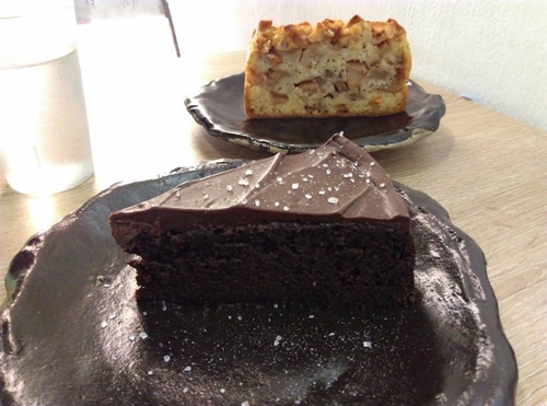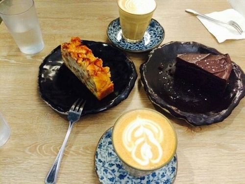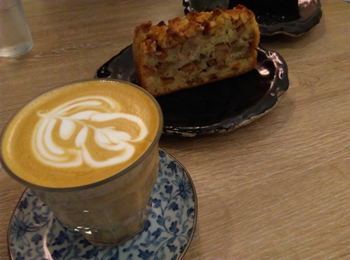 二人點了二杯咖啡和二款蛋糕,分別是熱拿鐵和白咖啡與生巧克力香蕉口味蛋糕和蘋果蛋糕。